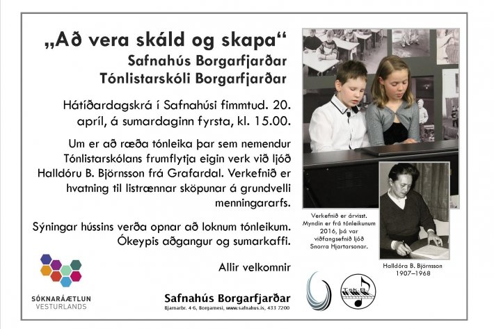 Við bjóðum til hátíðardagskrár í Safnahúsi fimmtud. 20. apríl, á sumardaginn fyrsta, kl. 15.00. Um er að ræða tónleika þar sem nemendur Tónlistarskóla Borgarfjarðar frumflytja eigin verk við ljóð Halldóru B. Björnsson frá Grafardal.